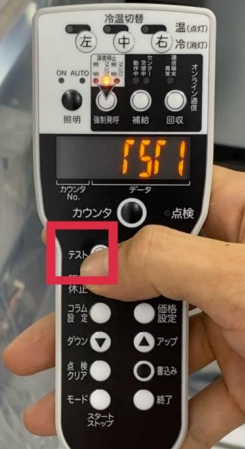 ①リモコンのテストボタンを一度押すと、<TST1>と表示されます。